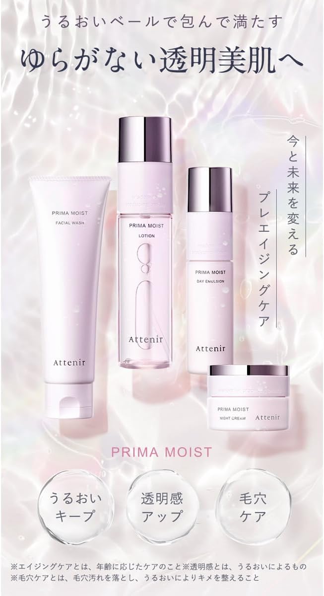 Prima Moist focuses on skin problems specific to people in their 30s, such as lack of transparency and luster and uneven texture. It breaks the dry cycle of skin that is prone to becoming unstable in people in their 30s, enhances the skin's barrier function, and leads to skin full of moisture. With "skin care for people in their 30s" that does not accelerate future aging, you can be beautiful now and in the future.