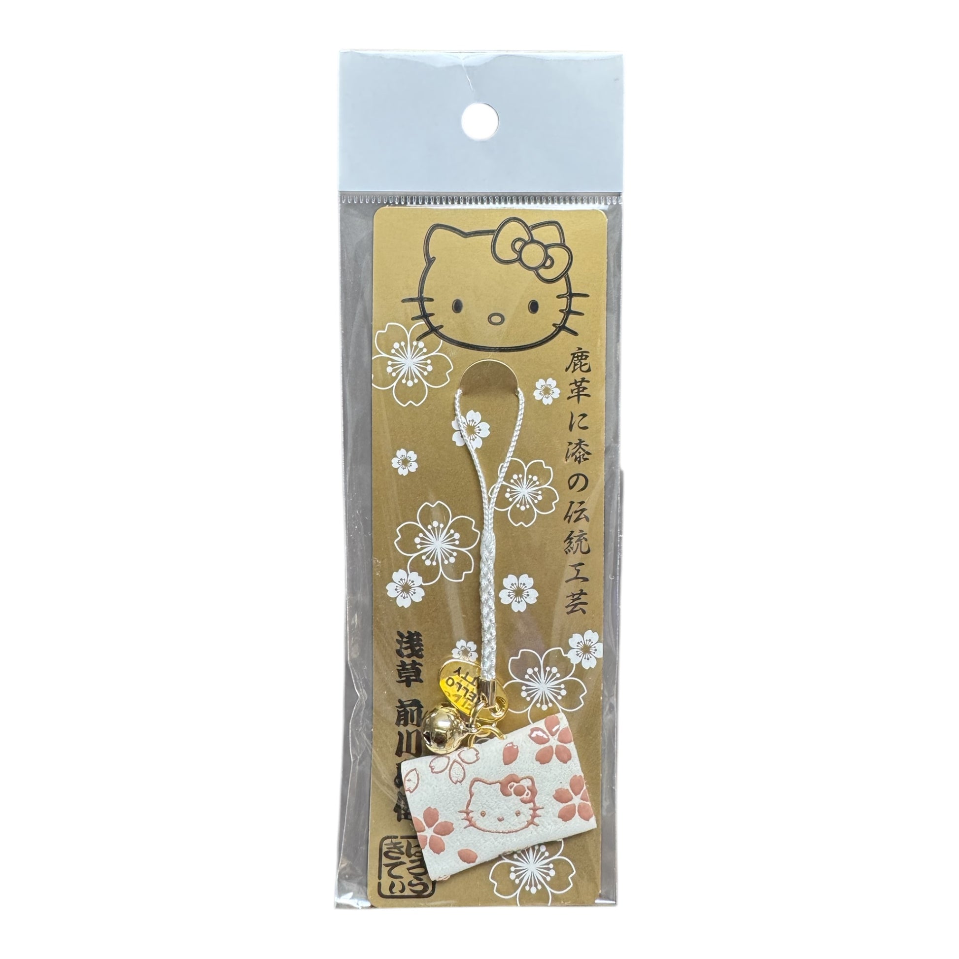 A Japan-made Hello Kitty omamori charm crafted with traditional Inden deer leather.