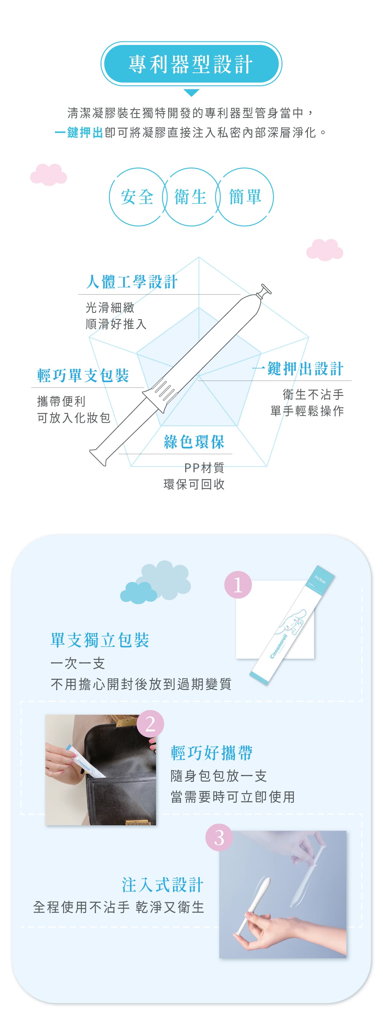 Although menstruation is a sign of health every month, caring for the intimate area (delicate zone) tends to be more time-consuming than usual. The stress of menstruation affects many things, such as having to pay attention to fashion, not being able to enjoy sports to the fullest, worrying about stuffiness and rashes on napkins, and having to carry sanitary products when going out. In fact, a survey showed that more than 30% of women are making some kind of effort to end their prolonged menstruation sooner. Women who want to end their prolonged menstrual period a little earlier or reduce the feeling of bothersome vaginal discharge, Inclear 2.9 contains 70% more cleaning gel than the regular Inclear (1.7g) for the purpose of cleaning the vagina. The package features Cinnamoroll, making it cute and easy for customers to pick up.