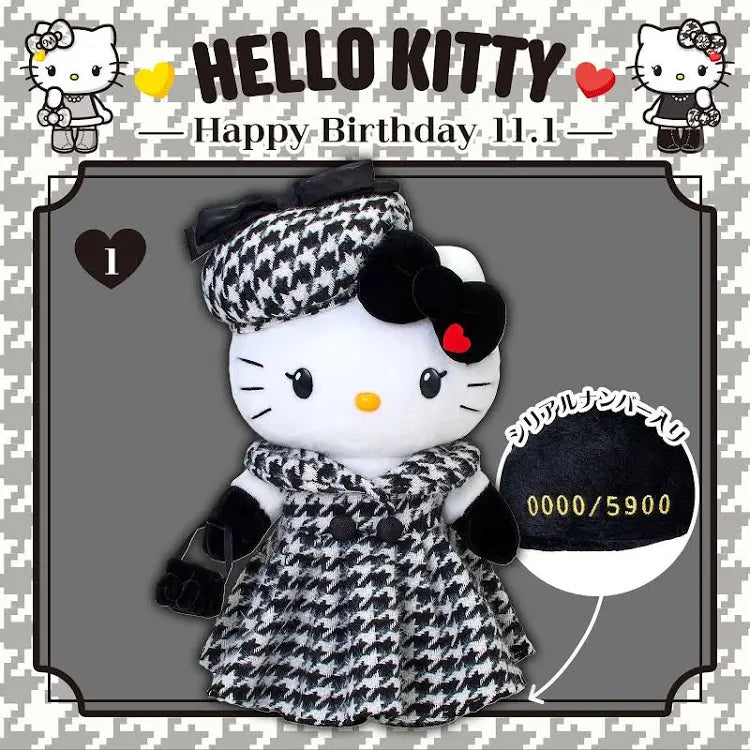 这款 Hello Kitty 生日限定娃娃 来自日本 Sanrio 官方 Birthday Doll 系列,以「千鸟格 × 黑白少女风」为主题设计,限量发售并附有专属编号,每一只都独一无二。