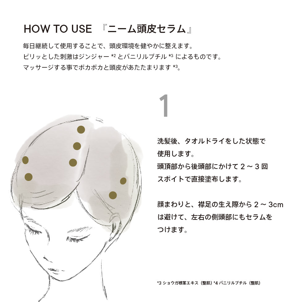By applying and massaging this serum, formulated with neem leaf extract and flax, into the entire scalp, it helps to keep the scalp soft and healthy, promoting the growth of supple hair with firmness and body.