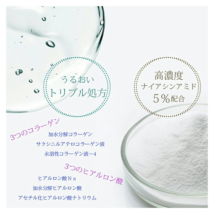 Other Ingredients: Hydrolyzed Collagen Powder, Water-Soluble Collagen Liquid-4, Succinylated Atelocollagen Liquid, Black Sugar Extract, Acetylated Hyaluronic Acid Sodium, Sodium Hyaluronate-2, Hydrolyzed Hyaluronic Acid, Prune Enzyme Hydrolysate, Chenpi Extract, Kiwi Extract, Seaweed Extract-1, Acerola Extract, Horse Chestnut Extract, Chamomile Extract-1, Thyme Extract-1, BG, Concentrated Glycerin, Glycerin, Glycerol Glucoside Liquid, POE Hardened Castor Oil, Hydroxyethylcellulose, Carbomer, Xanthan Gum, Potassium Hydroxide, Diethylenetriamine Pentacetate Sodium Liquid, 1,2-Pentanediol, Phenoxyethanol